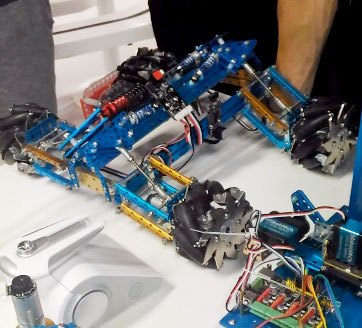私が気にいったのは、真横にもすすめるタイヤのパーツです。(だいぶ前からロボットの乗る車を作ろうと思っていて、それにぴったりです。)MakeBlockのパーツを組み合わせると3Dプリンタの作成も可能です。また、ドローンを作れるAirBlockというのも最近、出したようです。