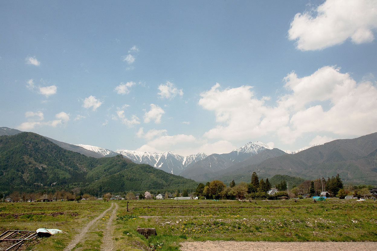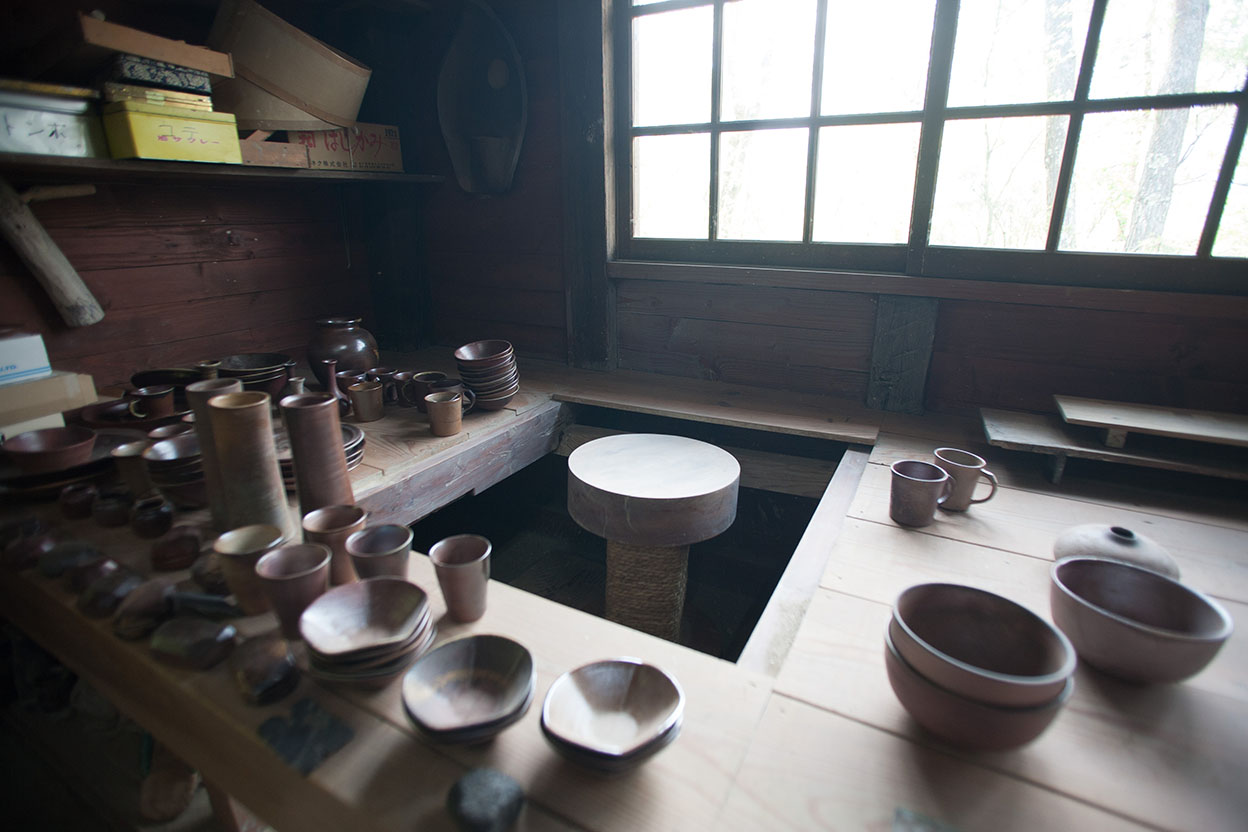 東京から特急を使って約3時間、清流流れる山脈の麓に安曇野はある。豊かな自然は多くの作物を育て、その土地に住む人々を潤す。また幅広い平野をもつおかげで、大パノラマの絶景を鑑賞出来るのもこの土地の特徴である。そのような魅力ある場所に何人かの陶芸家が集落を作っている。「アツムイ窯」はその中の一つなのである。