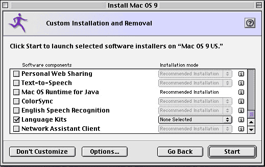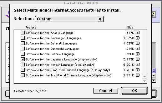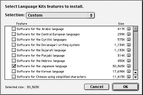 If you are running Mac OS version 9 or over, Japanese support is included in the system installation CD. You can add this support to a previously installed system. To do so, use the CD to make a custom installation, first selecting "Language kits", then "Software for the Japanese language". See below for a detailled procedure.