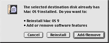 You will be confronted with the usual series of dialog boxes (like the one asking you to accept the Apple license and take an oath of allegiance to the company excecutives). Click along... If you have partitioned your hard disk, choose the partition that contains the system folder you want to add to (you might have several partitions with several operating systems).