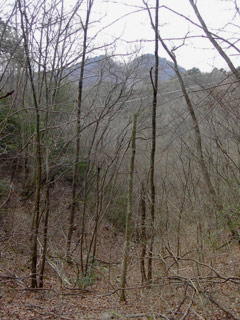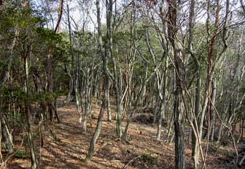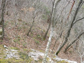 出会うだろう。かなり急な斜面だ。葉が落ちた雑木林。所々に岩が出る。下っていくと低木が