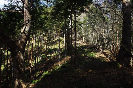 一人がやっと通れる仕事道に変わった。沢から外れて右手の植林の中、源頭部を登って稜線に乗った。