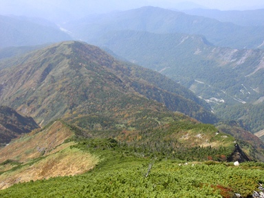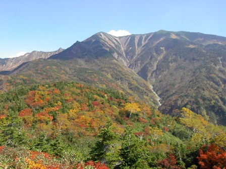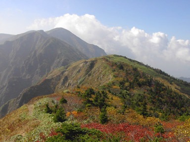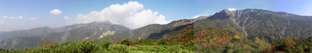 錦秋の尾根や谷が行く筋も落ちている。東の南白山へ続くハイマツ帯とその先の彩りも捨て
