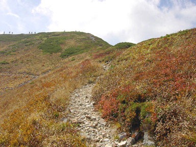草紅葉、ハイマツと青空。そんな漫歩気分のの稜線とは対照的にリッジの裾にへばりついた