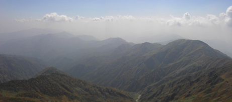 別山平から三ノ峰、銚子ヶ峰、大日ヶ岳への長い稜線。三ノ峰から右には赤兎や大長山の影。