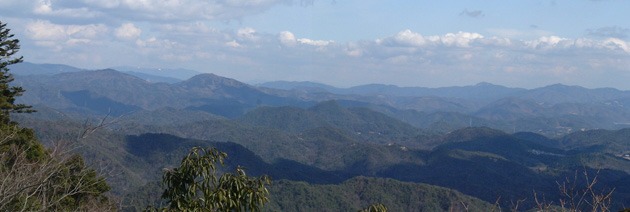 杉林の中、古い石段を登っていくと時折ヒヨドリの声が聞こえてきます。 植生が雑木林に変わりロープの立派なてすりが出てきます。 途中、「六丁」にあたる六丁峠にはお地蔵さんがおられます。 ここから平坦道を少し行くと右側に大岩ヶ岳や千刈水源地、大峰山方面が 展望できるポイントがあります。 ちょっとした景色ですが気に入っています。