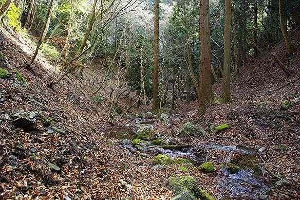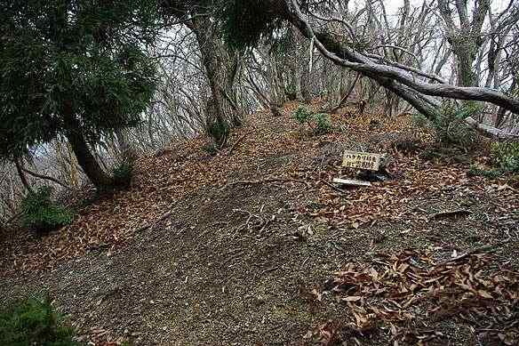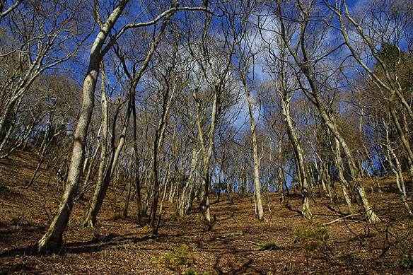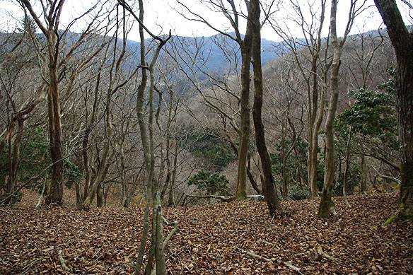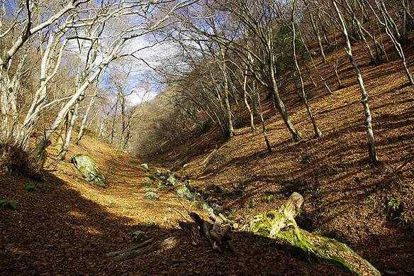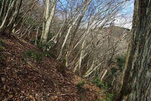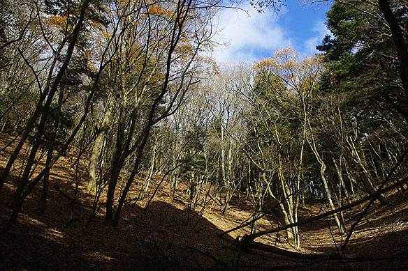 寺山峠は広い峠で植林から雑木に変わる。低い陽射しが落ち葉を照らす。