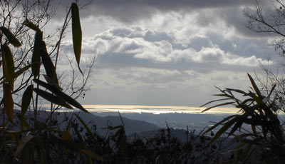 切り開いてある。六甲が黒い影となり大阪湾が光っている。目当ての支尾根はそろそろかなと