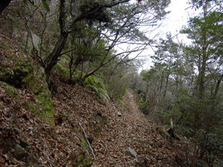 みると人影多い縦走路から一転、野趣あふれる巻道が雑木林の中に続く。こんもりとした