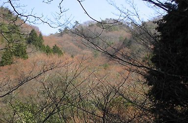 やっと極楽茶屋跡。北の峠を越えて谷を少し下りるとブナ林。赤い芽が枝先を覆っている。