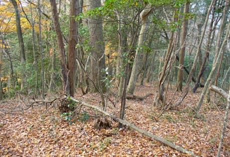 時々倒木があります。植林に入り、少し広がったところに石で囲った枠取りが残っています。たぷんここが鳴の堂跡
