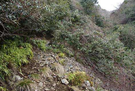 右手に谷の沢が近くなって上り調子になると、道は荒れる。ゴロゴロした石とつるやイバラ。