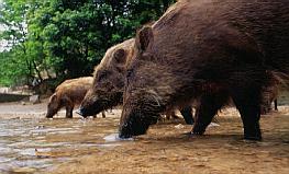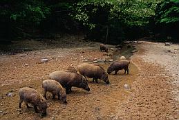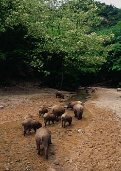 いつもの川に集結したイノシシ軍団。得意の餌採りが始まった。