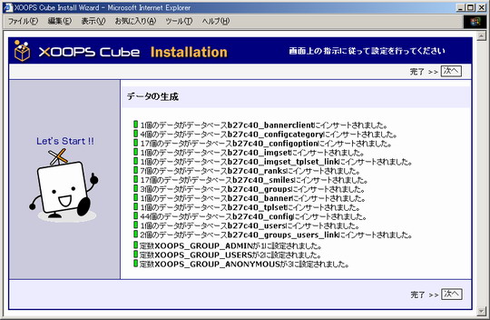 xoops環境ファイル(mainfile.php)の更新とデータベーステーブルの作成がおこなわれました。