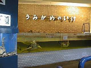 チケットを買い、1階に入って正面奥にウミガメがいます。ガラスが低く、カメに触ることもできそうですが、水がバシャバシャと上がっていてあまり近づけなかった。その他の水槽はあまりに暗く、朝早くでまだ掃除のおばちゃんがウロウロしてたんで撮りませんでした。(けっしておばちゃんを撮りたくなかったわけではない)最後に出ようとしてふと入り口付近をよく見ると、あのウーパールーパー(アホロートル)が汚くなった水槽の中にごちゃごちゃと入っていた。あまりに哀れに見えたものでカメラを向けられなかった。 |