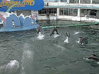 約30分のショー。輪回し、輪くぐり、ジャンプ、そしてダンス。なかなか見せてくれるが、欲を言えばもうちょっとジャンプにひねりを加えたような派手なものにしてほしい気がした。あのプールの大きさからいえばしょうがないかもしれないが。 |