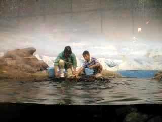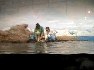 選ばれた5人は全員で手を洗った後、 一人ずつ入り口そばの水槽の中へ。 飼育係の人と話しながらのエサやりは約3分間。 |