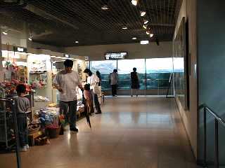入り口すぐにあるもうひとつの水槽。 ここにも3頭のラッコがいます。 手前に見えるのはラッコグッズを多数 取り揃えたショップ。 あちこちの壁にはラッコや他の海獣たち との比較などのパネルがたくさん。 |