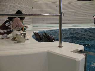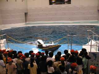 小学生の団体の声に誘われて一緒に遊ぶように 突然1頭のイルカが浅いステージに上がってきました。 子供たちはおおはしゃぎ!! |