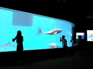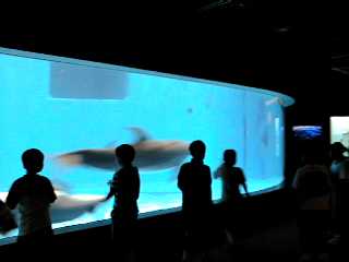 | ここも地下からイルカが泳いでいる様子を見ることができます。 でも、かなり泳ぐスピードが速いもんで、きっちりとは撮れてません。 | |