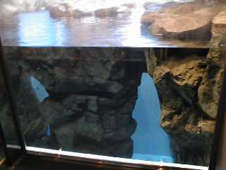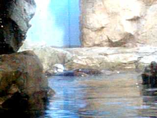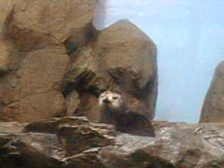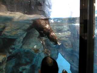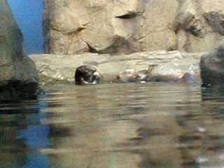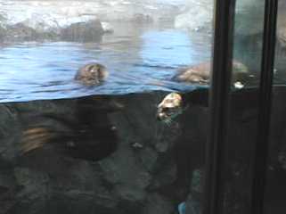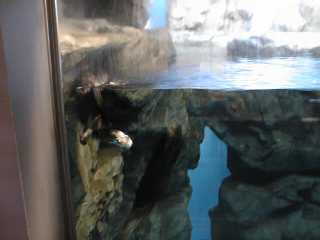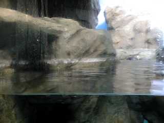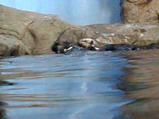 時々母子いっしょに泳いでこちらの方に来ます。 でも、ほとんどは奥の方にいてよく見ることができなかった。 と、言い訳するようにあまりよい写真が撮れませんでした。 ここには全部で3頭のラッコがいますが、お父さんラッコの 方はお母さんに育児に専念してもらうために裏の水槽に いるとのことです。 |