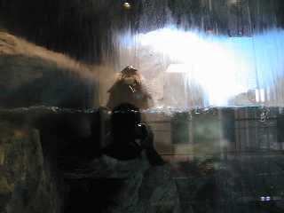 時々ガラス面をきれいにするために水が出てきます。 すると待ってましたとばかりに赤ちゃんラッコの方が やってきてその水を飲んでます。 数少ないシャッターチャンスです! しかし、この水。ちょっと中途半端にしか出ないんで 余計にガラスの汚れが目立ってました。 |