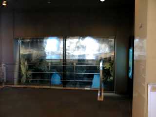 | さて、この上の2枚の写真。午後3時から4時ぐらいにラッコ水槽を撮ったものです。 なんだか偉そうなおじさん達がラッコ水槽を囲んで何やらガヤガヤと話し合ってました。 見ると、その中には飼育係らしき人もいます。そこで、何をやっているのか聞いてみたところ 水面が高すぎて見にくいので水位を下げてみてるのだ、ということ。水位は全部で20cmも下げてました。 白い線が見えますよね。これはついさっきまでの水面の高さです。 水の中に含まれるカルシウムのせいであんなふうに白い線になってしまうということです。 ラッコもたまらずバタバタしているようでしたが、それを見ていた偉そうなおじさん一言。 「おぅ、ラッコも元気に泳ぎ始めたぞ。こっちの方がうれしいんかな」 って、おい!ラッコはどう見ても動揺してるぞ!と言いたくなった。人間側の都合だけでコロコロ変えないでほしいです。 ここのラッコ水槽は通路の途中にあるんで人の往来がラッコのストレスにならないかが気になりました。 しかも通路には外光がよく当たってるので、とっても明るい。 私が見たところ、この日の小学生の団体が通路を通ってるのを時々ラッコが気にしているようでした。 | |