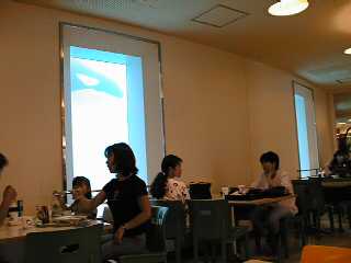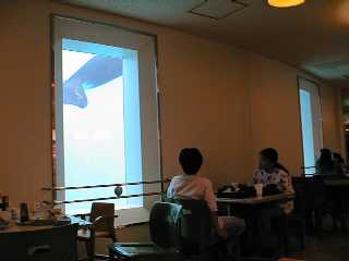 シャチショーのプール下にはレストラン・オーシャンがあります。ここでは写真にあるようにシャチが泳ぐ姿を見ながら食事をすることができます。窓の側の席は取り合いなんで、座るのは大変ですが、間近で濡れることなくシャチの姿が見られます。