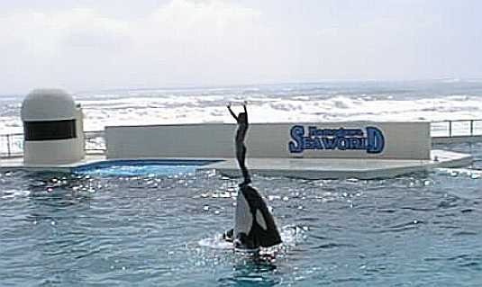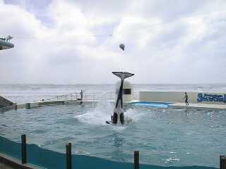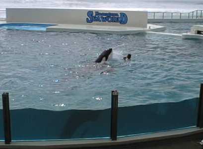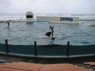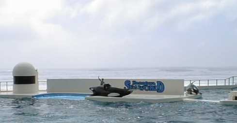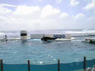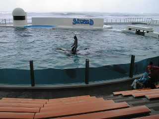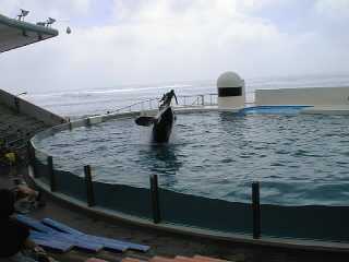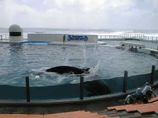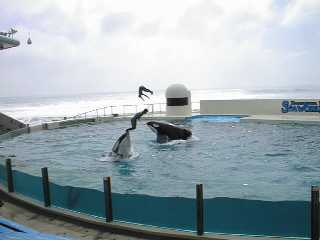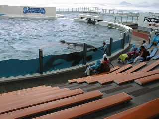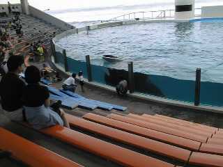 最後にまたステージに上がってのあいさつ。その向こうのプールのシャチもステージに上がってます。あの巨体が上がったり下りたりする時がまた器用です。 |