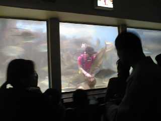 日に何度も行われるえさやり。 魚たちは「マリンガール」の手から直接えさをもらいます。 今では全然怖がりません。 |