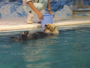 | お食事タイム開始! 飼育係の人はとても丁寧にラッコについて 説明してくれます。 この時間になるとお客さんがいっぱいでした。 | |