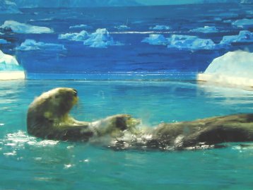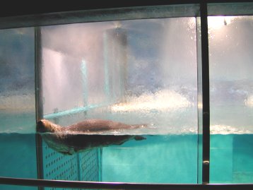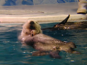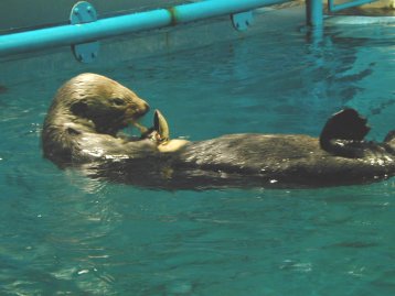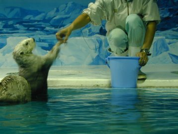 | ここのラッコは貝割りを見せてくれます。 これはガラスに叩き付けて割っているところです。 | |