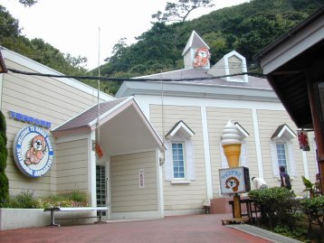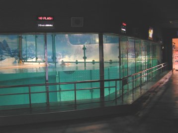 | これがラッコハウス内のラッコ水槽。 奥にはラッコ等のグッズが売られています。 真ん中には仕切りがあり、手前が予備水槽となってます。 | |