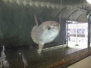 大きく壁で囲まれた建物の中にマンボウが2頭いました。どこにいるんだ?と思って見上げると上で口をパクパクさせながら泳いでました。マンボウはガラスにぶつかってしまうと死んでしまうらしく、ガラスの内側のビニールで守られてました。そのビニールにずっと張り付いていたんで、なんだか外に泳ぎ出したいように見えました。