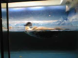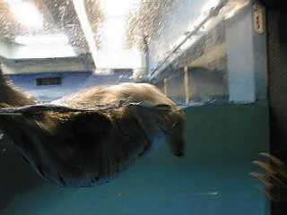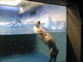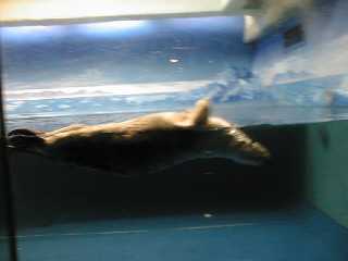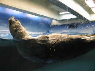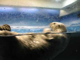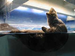 水族館の建物の中を進むと人だかりが。ラッコのところはやっぱり人が集まっています。そのためになかなかいい写真が撮れませんでした。ここのラッコ舎は天井がとても低い。エサをあげるためにお姉さんが入ってくる時に大きくしゃがむようにしないと頭をぶつけてしまいそうです。ラッコは本当はとてもデリケートで、輸送するだけでも大変なんです。それなのにこの天井の低さ、明るいライトの近さ、お客さんの視線の多さとラッコのストレスは大丈夫だろうか。客寄せのためだけにむやみに狭いプールにラッコを詰め込むのは、外国からも批判を受けているそうなので、もう少し余裕を持たせてほしい気がしました。 |