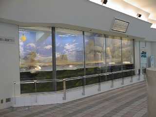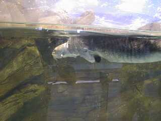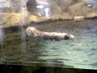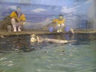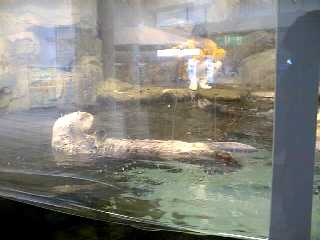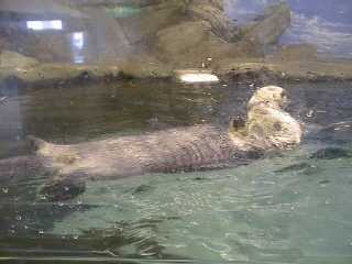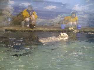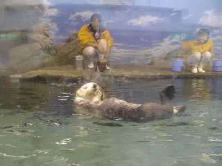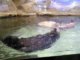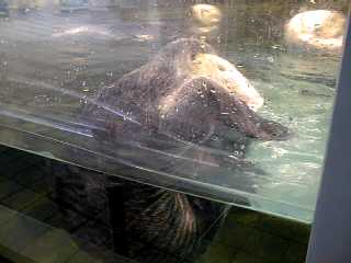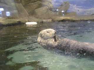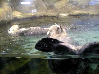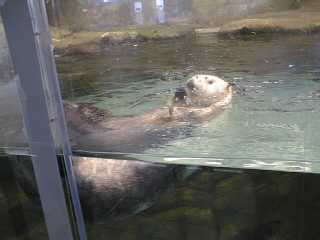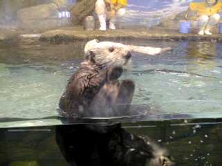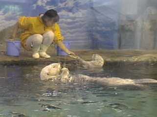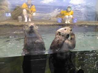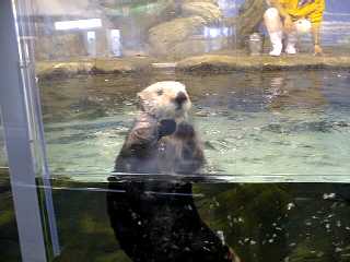 ここのラッコは飼育係の方の指示で、 水槽をバシバシたたいて、お客さんにあいさつします。 場合によっては2頭そろってあいさつに来てくれます。 |