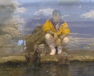 えさの時間の前にはラッコ舎内の気温と 水をチェックしています。 それを興味深げにラッコも見ています。 |