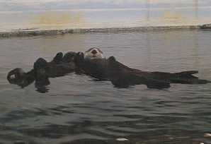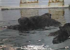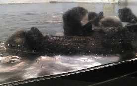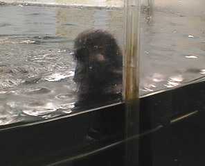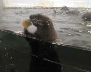 今度は窓に鼻を押し付けて「ブブー」と遊んでます。 これは先輩ラッコのメイちゃんもよくする行動。 おもしろいのかな? |