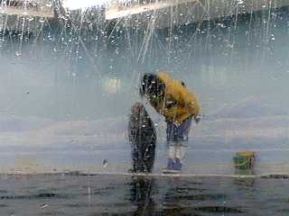 えさの時間は1日4回。 飼育係の岡田さんが入ってくると殺到してきます。 |