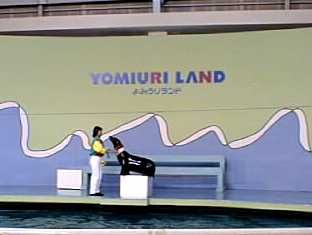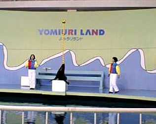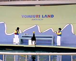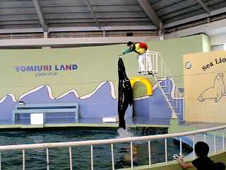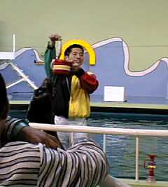 首には8つの輪をかけてますが、 これはトレーナーの方が水槽にいるアシカ向けて 投げたものをすべてキャッチしたものです。 泳ぎながらもすべて首に掛ける技は凄いもんです。 |