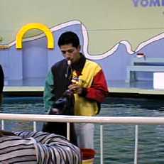 | 左の写真から右の写真へと演技しています。黄色い棒の上にあるボールをうまく棒を除いてキャッチします。 | |