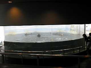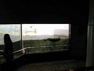 こちらがメインの水槽です。 開設当初、曲線の水槽を作るために材質はアクリルを使用。 ですが、水槽のアクリルが交換不可能なために、 傷を付けられても良いように、内側に取り外し可能な薄い アクリルを付けてます。 これを交換するのがとても大変な作業のようで、出来るだけ 傷を付けられぬようラッコに貝殻はあげてないそうです。 そのため、ラッコの貝割りを見ることはできません。 上のような理由があるため、仕方の無いことなのです。 |