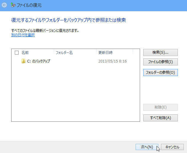 「ファイルの復元」画面に「C:のバックアップ」が追加される