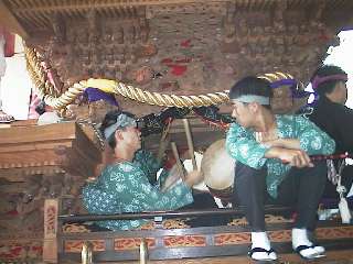 左の写真はだんじりに乗っている鳴り物のみなさん。太鼓と笛でだんじりばやしを奏でている。鳴り物の稽古は9月から行われていた。毎晩8時から11時近くまでドンドンピーヒャラと鳴り響いていてとてもにぎやかなので、近所の家は結構大変かも。