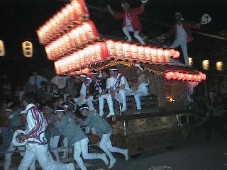 一度家に帰って、夜にもう一度見に行った。うちから歩いて5分くらいなので気楽に出かけたが、風が強くて結構寒かった。だんじりは夜でも結構マジで走っていてすごい迫力だった。見物客も多くなっていて、自転車で航路を横切ろうとした子供が「事故防止委員」のおじさんにどやしつけられたりしていた。それにしても明かりのともっただんじりはとてもきれいだ。昼間はよく見えなかった中の彫り物もよく見えたのでよかった。