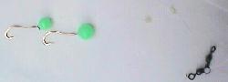 ・約7mm大の緑の蛍光玉(シモリウキ)を針の付け根にくっつけたものを使用した