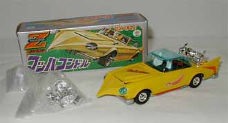 マニアックな車かも ダットサン(日産)フェアレディSR311を 改造している様です。 屋根はソフトトップなんでしょうね。 この頃“マッハ”と言う言葉が流行っていたのかもしれません。 今の特撮じゃここまで改造も出来ないでしょうねぇ(笑) |