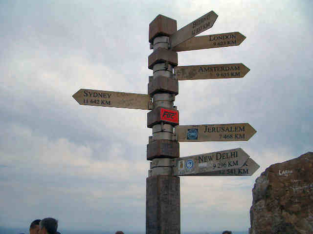| ◆喜望峰を眺めるためケープ半島の最南端ケープ・ポイントへ向かう。 半島南部は広大な自然保護区になっており世界遺産 ケープ植物区保護地域となっている。ケープ・ポイントと喜望峰もこの中にある。 まず保護区域内の道路の終点にある駐車場から大きなゆったりとしたケーブルカーに乗りケープ・ポイントの頂上へ向かう。天気がよく快晴で広場の展望台から眼下前方に喜望峰と大西洋が見渡せる。海抜248m、頂上のルック・アウト・ポイントにある旧灯台を目指して上ると、ロンドン、ニューデリー、シドニー、アムステルダムなど各地を示す方向案内板がある。山の頂上の旧灯台は、インド洋と大西洋の二つの海流がぶつかり、霧で見えない事が多く海難事故も多発、1919年にケープ・ポイントの山の先端で海抜87mの地点にアフリカ大陸で一番明るい灯台が建てられている。 |