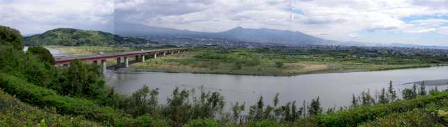 富士川SAから見下ろす富士川 中央遠方は愛鷹山塊