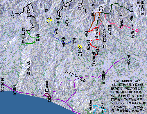 下界は霧の中だ。13:15不動尻に向かって下山開始。途中メーンの下山路である見晴台への道を分け、北進すると地図にない道が七沢の方角に下っている。これを無視して気持ちの良い尾根道を更に進む。雨はますます本降りとなって地図は雨でびっしょりになる。痩せ尾根を越えるとあずまやのある唐沢峠に至る。あずまやで濡れたシャツを脱ぎ、レインコートを羽織る。ここからは地図にない 枝道が左右に分かれているが、直進して小高い丘の上に出る。右折して不動尻に向かう。コンチャンはここで直進して道に迷ったのだろう。途中保護されているモミの巨木を見る。不動尻はキャンプ場であった。アスファルト舗装した林道を巡礼速度で歩いて遅れを取り戻す。無灯火の 「山神ずい道」を抜けて更に歩くとやがて広沢寺の屋根が見え、1軒の温泉宿が見えた。広沢寺温泉であった。16:30着で予定より30分遅い。雨のためだろう。残念ながら温泉は ウィークディは16:00で終了であった。